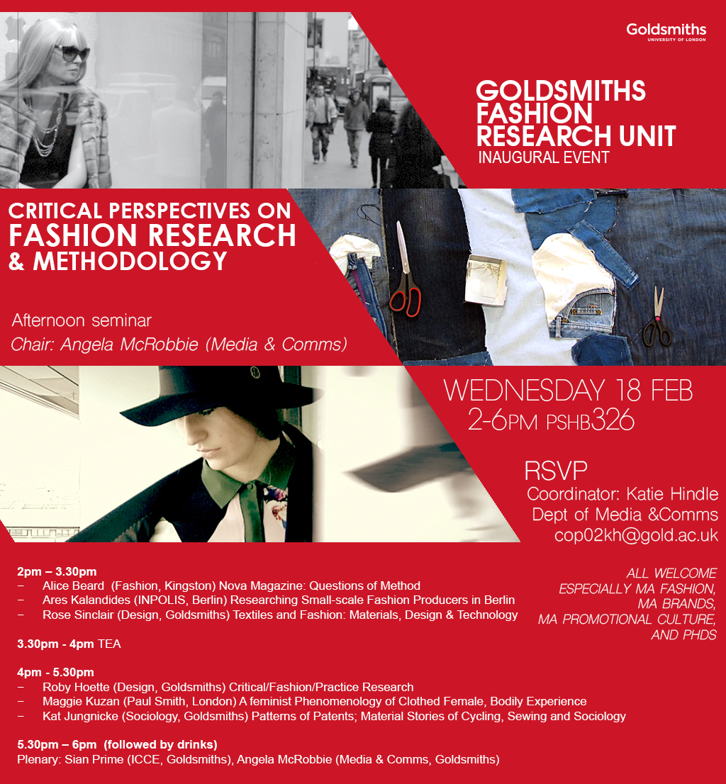 The inaugural event organised by the new unit will be an afternoon seminar, “Critical Perspectives on Fashion Research and Methodology”, on February 18th, starting 2 pm. Entry to the event is free (email Katie Hindle, cop02kh[@]gold.ac.uk, to RSVP) – you can find a full list of speakers on the Goldsmiths website.