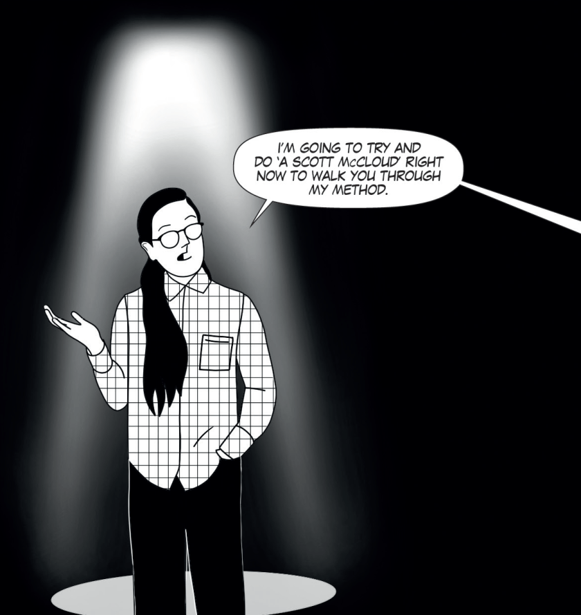 “In one particular bit of the comic I’m trying to explain my method, so I drew myself as Scott McCloud and imitated his style, so that I can talk the reader through it. In another chapter, Wonder Woman makes an appearance. I was looking at a misunderstanding between a couple of friends, and one of them is quite feminist, but when she goes off on a rant, she immediately regrets it afterwards, “ah, they probably think I’m really weird , I wish I just gave a straight answer”, so in here she’s transforming into Wonder Woman and making the other characters see their wrongs. By the end of the chapter, she pulls them up and flies them up in the air, from the micro to the macro, and then drops them back down to the micro. Then you realise in the next page that it’s all in her head, and and she just wishes she did that, instead of it actually happening. So it’s using an already existing character for a re-imagined purpose to give it new meaning.”