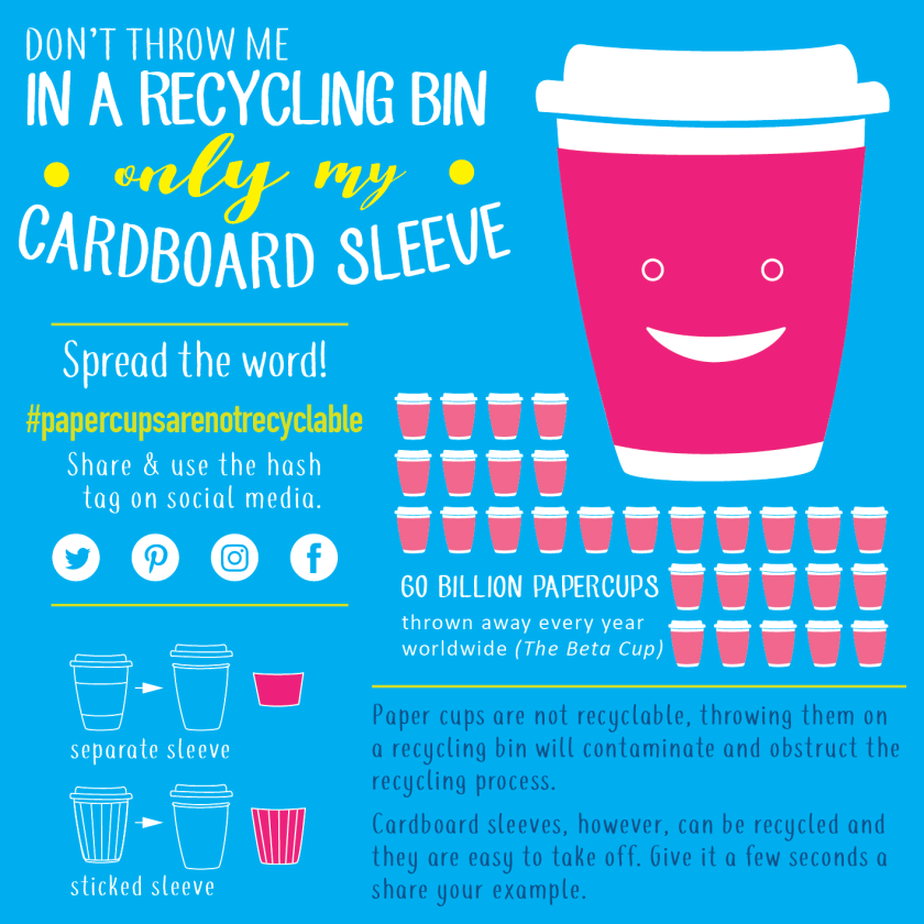Follow papercupsinfo on Twitter, Facebook or Instagram, and share its call to awareness with the hashtag #PaperCupsAreNotRecyclable.
