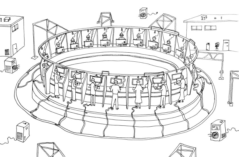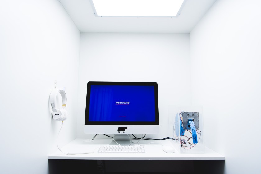 Another outcome is a futuristic office space, which alludes to traditional office spaces, but also to milking parlours for cows, hospitals, and arcade games. It’s a booth in which you go, make your contribution through an interactive program which consists of answering five randomly generated questions, and receive tickets from a machine. Maybe it would be something that crops up on the street, like a telephone box, or a passport photo booth. It speculates a working world where jobs don’t exist anymore, or very few of them exist, and where human existence relies upon just giving data.