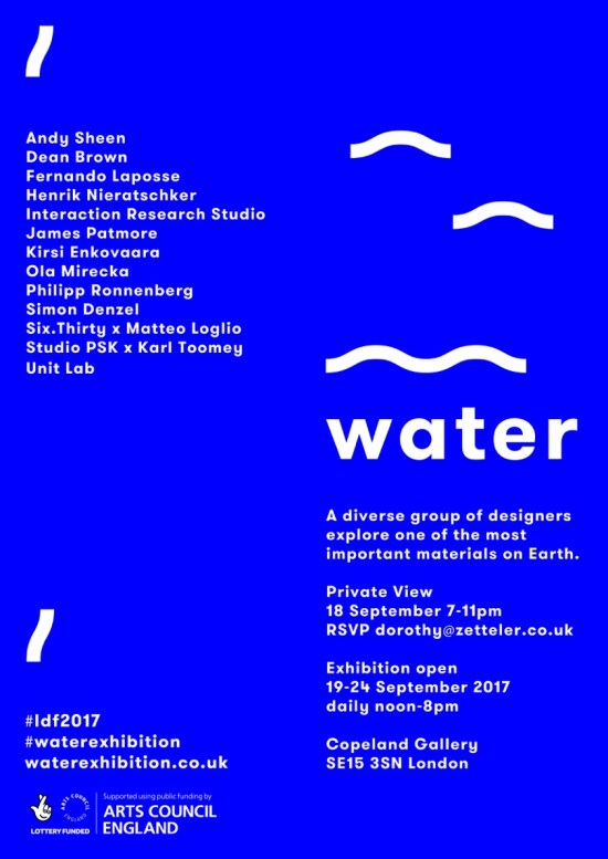 For London Design Festival 2017, a group of 13 designers are coming together at the Copeland Gallery in Peckham’s Bussey Building to explore Water. Each of them has created a new work for the exhibition, responding – creatively, technologically or emotionally – to water and the vital role it plays in the natural and human world.