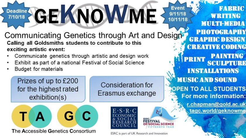 The Accessible Genetics Consortium (TAGC) in Collaboration with Goldsmiths, University of London are taking part in the ESRC Festival of Social Science, and they’re looking for artists and designers to contribute to the event. During the Festival, TAGC will be exhibiting innovative art work designed to help communicate some fundamental genetics concepts.