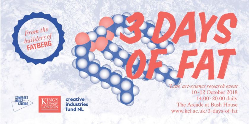 Taking place at Bush House Arcade, London from Wednesday 10th – Friday 12th October 2018, ‘3 days of fat’ is a ‘live’ art-science event focused on the construction of an island of fat – a ‘fatberg’. The event is part of the research of Goldsmiths Design PhD student Mike Thompson. It includes a series of themed experiments, performances and discussions brining together artists Thought Collider and Arne Hendriks with King’s College London’s Department of Nutritional Sciences and experts from art and culture, life sciences, food, agriculture and healthcare to discuss humanity’s complex relationship with fat, what it is and what it might become.