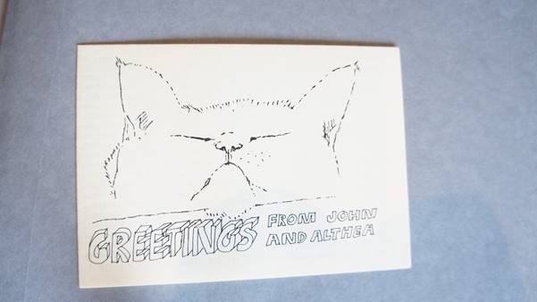 As I have researched more about Althea, it is ephemera such as the yearly greeting cards she made in the two images below from the archives of The George Padmore Institute in Stroud Green (which her friend John La Rose had co-founded) that are touching. They tell of journeys and friendships she made across Europe to the various textile mills, and stop-overs at cities and places. But more than that, they capture another side to Althea. Her love of animals – especially cats, of which she had several.