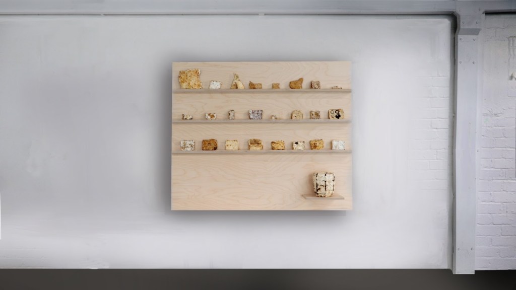 The material is still in the development process, a basic method has been developed, now I seek to explore methods of application and ways to build larger structures. A display wall was created to show the evolution of the material development and to engage a wider community to start growing and learning about biomaterials, open sourcing my material method.