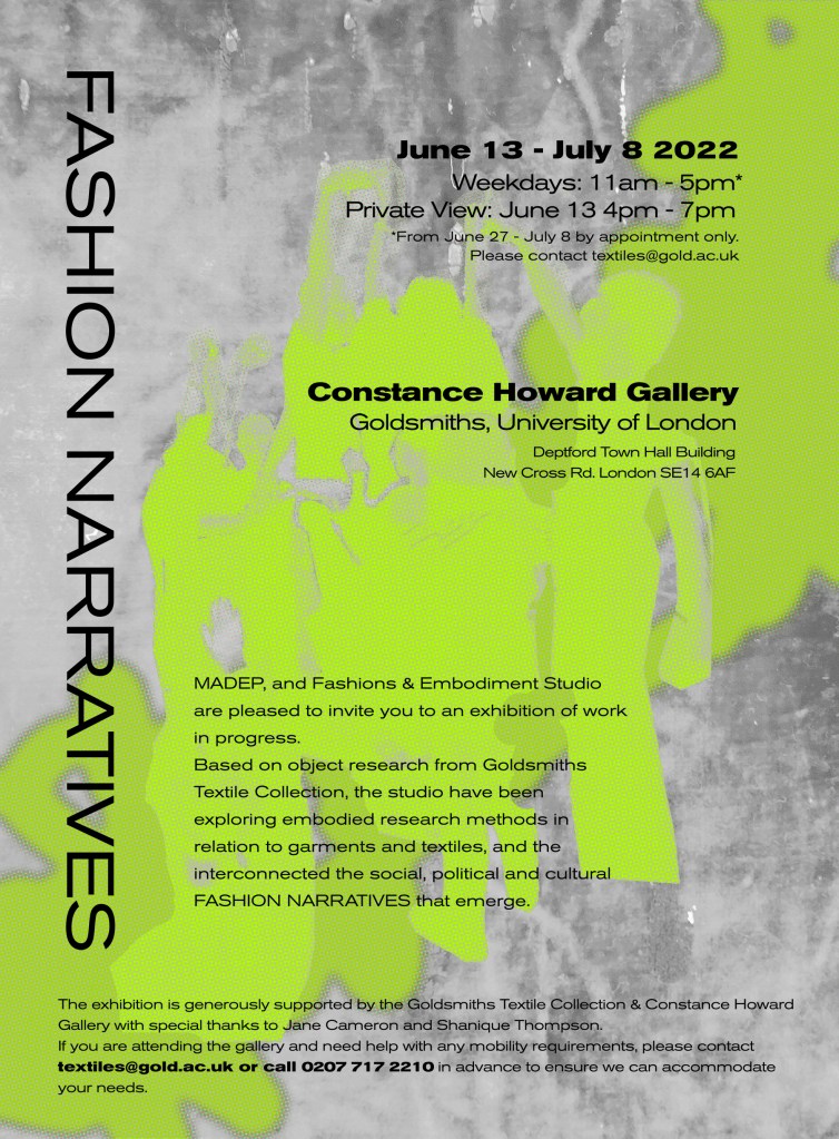 MADEP, and Fashions & Embodiment Studio are pleased to invite you to an exhibition of work in progress. Based on object research from Goldsmiths Textile Collection, the studio has been exploring embodied research methods in relation to garments and textiles, and the interconnected social, political, and cultural FASHION NARRATIVES that emerge.