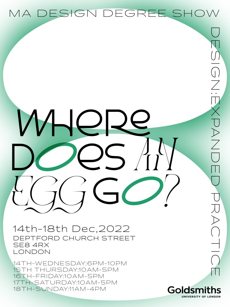 Where does an EGg gO? The Goldsmiths MA Design Degree show is coming soon! Save the date: 14-18 December 2022 please follow the official instagram account for more details: https://www.instagram.com/where_does_an_egg_go/ Share this: Click to share on X (Opens in new window) X Click to share on Pinterest (Opens in new window) Pinterest Click to share on Tumblr (Opens in new window) Tumblr Click to share on Facebook (Opens in new window) Facebook Like Loading... Related